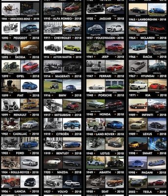 “Un percorso nella storia dell’automobile” è un vero e proprio viaggio nella produzione automotive mondiale, partendo dal primo veicolo a tre ruote del 1886 di Mercedes-Benz fino al full electric proposto da Tesla nel 2003. In mezzo una vera e propria rivoluzione culturale e di movimento raccontata da Peugeot (1890), Skoda (1895), Opel (1899), Fiat (1899), Renault (1899), Cadillac (1902), Ford (1903), Rolls Royce (1904), Lancia (1906), Suzuki (1909), AUDI (1909), Alfa Romeo (1910), Chevrolet (1911), Aston Martin (1914), Maserati (1914), BMW (1916), Mitsubishi (1917), Toyota (1933), Jaguar (1935), Volkswagen (1937), Jeep (1941), Ferrari (1947), Porsche (1948), Honda (1948), Land Rover (1948), Lotus (1948), Abarth (1949), SEAT (1950), Subaru (1958), MINI (1959), Lamborghini (1963), McLaren (1964), Dacia (1966), Hyundai (1967), KIA (1971), Infiniti (1989), Lexus (1989), SMART (1998), Pagani (1998).