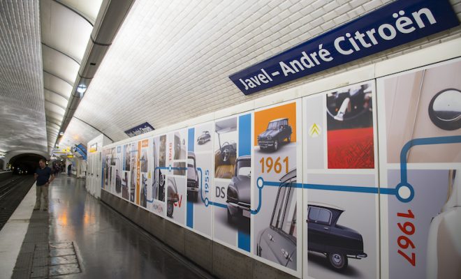 All’ingresso della stazione, alcuni pannelli informativi raccontano la storia di André Citroën e del quartiere di Javel. Lungo i binari, un grande pannello ripercorre la storia Citroën, con le date fondamentali e le foto dei modelli emblematici. L’originale decorazione coniuga abilmente il DNA di Citroën e quello della RATP, integrando la grafica di una linea della metro che come una linea del tempo si estende per tutta la lunghezza della pannellatura. Novità assolute anche i tre “touch screen” che permettono ai viaggiatori di accedere a Citroën Origins (www.citroenorigins.com), il museo virtuale di Citroën. Un’opportunità per immergersi ancora di più nella storia del Marchio, attraverso immagini a 360° dei modelli, foto e aneddoti.