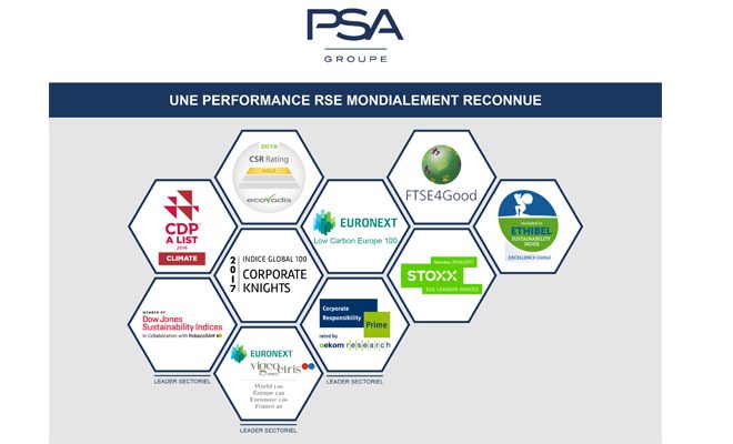 Il 6 ottobre 2017, l’agenzia di rating non finanziario Vigeo-Eiris ha riconfermato la presenza di Groupe PSA nei quattro indici ISR Euronext Vigeo-Eiris: “World 120” (le 120 imprese più avanzate a livello mondiale), «Europe 120» (le 120 imprese europee più avanzate), “Eurozone 120” (le 120 imprese più avanzate della zona Euro) e “France 20” (le 20 imprese francesi più avanzate). Questi indici identificano le imprese che hanno raggiunto i risultati migliori negli ambiti ESG4. La performance dominante del Groupe PSA in tali ambiti permette al gruppo di essere ad oggi l’unico costruttore di auto inserito in tali indici.
