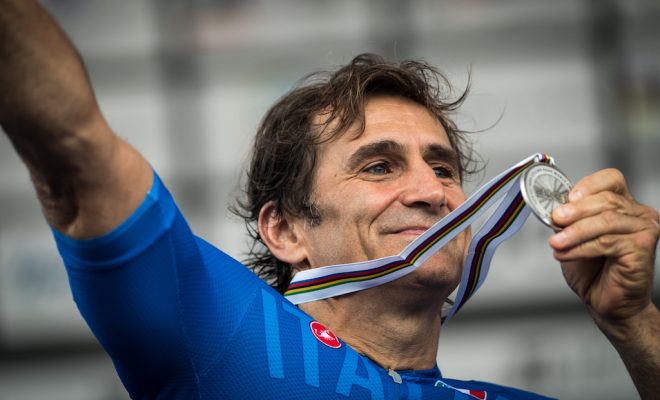 Folle di fan si sono riversati a Maniago per tifare gli atleti che hanno gareggiato a temperature molto elevate. Nella cronometro individuale di venerdì, Zanardi è arrivato terzo dietro a Oscar Sanchez (USA) e Tim De Vries (NED) e si è aggiudicato la medaglia di bronzo. Nella gara su strada di sabato, Zanardi ha dimostrato ancora una volta che arrendersi non è un’opzione per lui; era in lizza per il podio ma all’ultimo giro è stato coinvolto in un incidente con altri piloti. Un concorrente si è schiantato contro la barriera su un angolo difficile e ed è rimbalzato nella pista, colpendo un altro pilota. Zanardi non ha avuto modo di evitarli ed è stato colpito da dietro. Di conseguenza, la sua handbike è stata gravemente danneggiata. Zanardi aveva con sé una ruota anteriore di ricambio nell’auto di assistenza. Si è fermato per cambiare la ruota anteriore, ma non aveva il ricambio per la ruota posteriore destra danneggiata anch’essa nell’impatto. Nonostante l’incidente, ha continuato la gara con la ruota posteriore danneggiata e alla fine ha raggiunto il traguardo in ottava posizione.