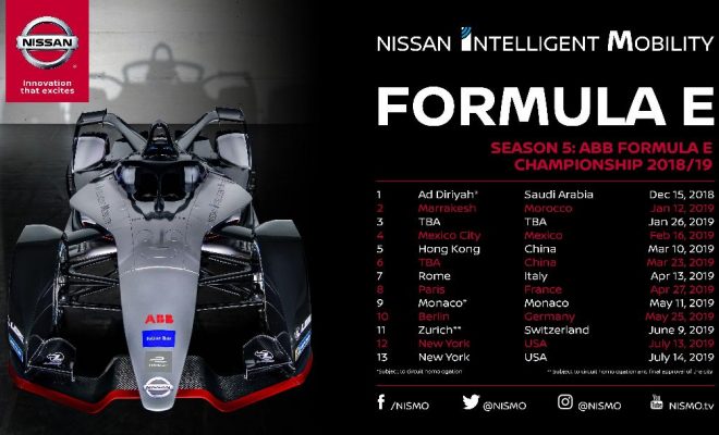 La quinta stagione della Formula E prenderà il via a dicembre 2018 e toccherà alcune delle principali città del mondo, tra cui New York, Parigi, Berlino, Roma, Zurigo e Hong Kong. Nissan ha espresso l’intenzione di prendere parte al campionato durante il Motor Show di Tokyo 2017 e presenta il concept della livrea al Motor Show di Ginevra 2018.
