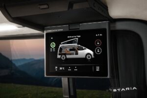 Nel concept l’abitabilità è dichiaratamente per due persone: non un loft su ruote, ma un van compatto (per la categoria) che prova a essere “facile” anche fuori dal campeggio tradizionale. L’allestimento punta su una zona living che si apre con sedili anteriori girevoli, un blocco cucina e soluzioni rapide per la sosta (tavolo estraibile posteriore, doccia esterna, vani dedicati). È un’impostazione coerente con un’Europa dove i campervan crescono, ma con regole e spazi spesso più stretti rispetto ad altri mercati: parcheggi, accessi, città, traghetti. E qui il design dello STARIA — già nato fuori dagli schemi dei van “quadrati” — diventa un vantaggio pratico, non solo estetico.