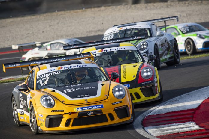 Sui 2,52 km del circuito del PEC Franciacorta, venerdì Fulgenzi aveva conquistato la pole position con il tempo di 1’07”965 e sabato si è confermato in gara 1 grazie a un ottimo spunto in partenza e in seguito a un’ottima difesa della prima posizione dai continui attacchi dei rivali alle sue spalle. Al termine di una corsa combattutissima, sul podio con il vincitore sono saliti Marzio Moretti (Bonaldi Motorsport – Centro Porsche Bergamo) e Simone Iaquinta (Dinamic Motorsport – Centro Porsche Latina). Nelle prime fasi Fulgenzi ha dovuto resistere agli attacchi di Gianmarco Quaresmini (Tsunami RT – Centro Porsche Brescia), a sua volta inseguito da Moretti. Dopo una manciata di giri, però, Quaresmini ha dovuto arrendersi con l’anteriore destra a terra a causa di una foratura lenta. E’ stato il primo, grande colpo di scena, che ha costretto al ritiro uno dei due capoclassifica della vigilia. L’altro, Alessandro Giardelli (Dinamic Motorsport – Centro Porsche Bologna), nel frattempo cercava di risalire la china lottando con tenacia ai margini della top-10, dove ha poi concluso ottavo.