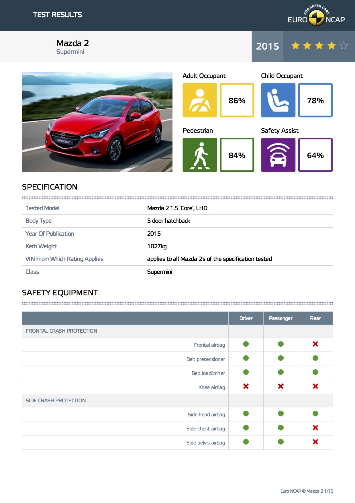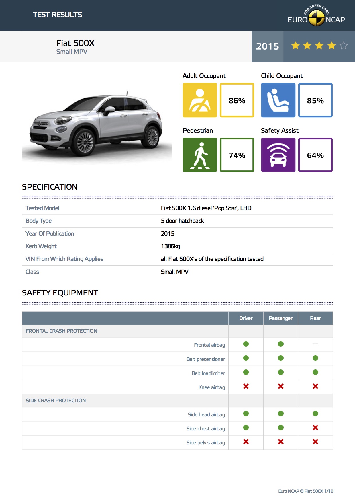 Confermato un buon risultato nel complesso per la Mazda 2 – soprattutto per la protezione dei pedoni, categoria nella quale raggiunge il top tra le auto testate in questa tornata con un notevole 84% – un discorso particolare merita la 500 X.