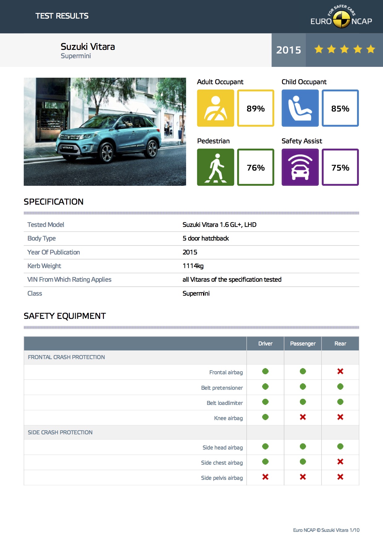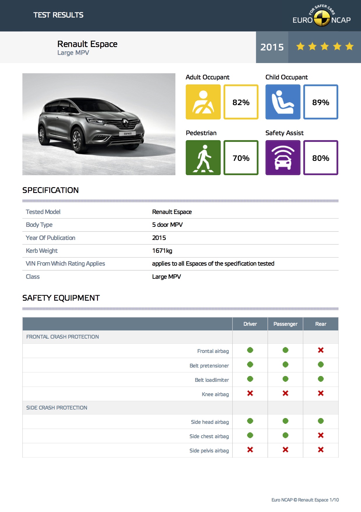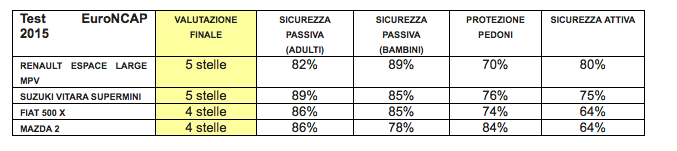 5 stelle per la Renault Espace che – in un quadro già generalmente molto soddisfacente- afferma la propria eccellenza nell’area della sicurezza dei bambini dove raggiunge un lusinghiero 89%, risultando la più sicura tra le auto sottoposte a test in questa sessione. Ragguardevole (89%) anche il risultato sulla sicurezza passiva degli adulti della Suzuki Vitara, l’altra auto che raggiunge le 5 stelle.
