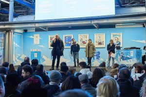 Una cerimonia dentro la fabbrica, con dipendenti e famiglie al centro