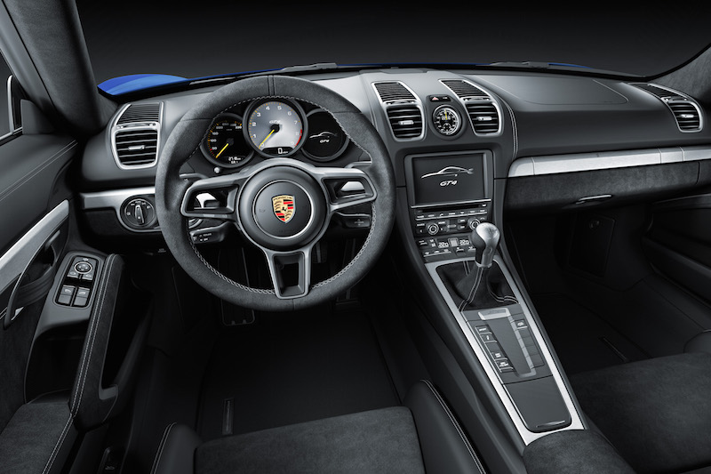 Gli interni della Cayman GT4 sono studiati per garantire a guidatore e passeggero un piacere di guida allo stato puro. I sedili sportivi sono rivesti in pelle e Alcantara e garantiscono un ottimo contenimento laterale. Le dimensioni compatte del nuovo volante sportivo GT4 assicurano un ottimo controllo e una risposta immediata.