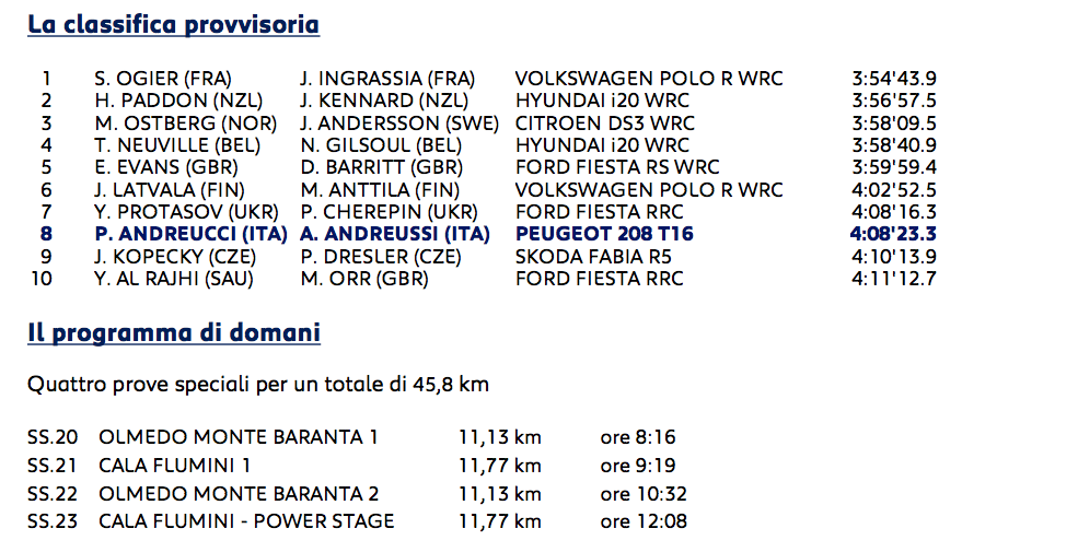 RALLY ITALIA SARDEGNA : ANDREUCCI AL VOLANTE DELLA PEUGEOT CHIUDE IL SECONDO GIORNO IN OTTAVA POSIZIONE ASSOLUTA