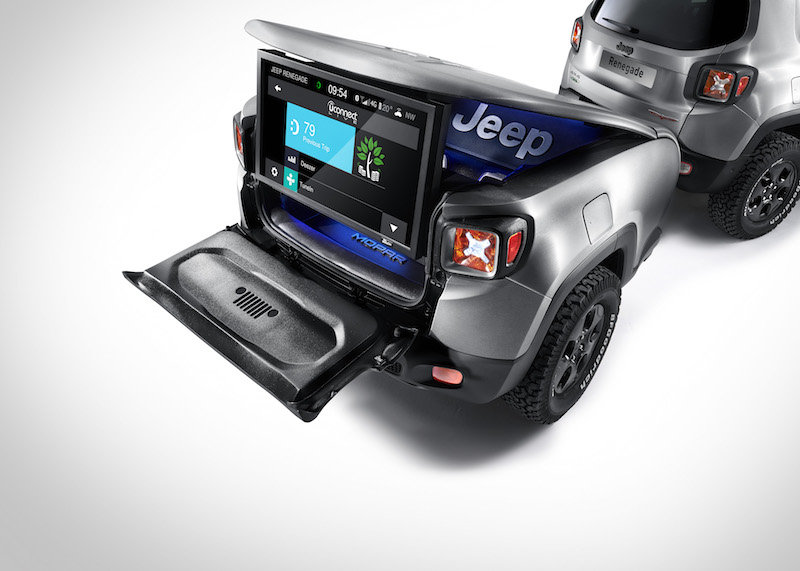 All’interno del trailer un display touch screen che mostra tutte le funzionalità del nuovo sistema Uconnect® LIVE, una piattaforma di servizi che permette di accedere alla Internet Music (Deezer), Internet Radio (TuneIn), Notizie (Reuters), Traffico in tempo reale (Tom Tom LIVE) e Social Network (Facebook e Twitter). Disponibile a partire da giugno sul modello Renegade – è la prima vettura Jeep a proporlo – il sofisticato sistema di Infotainment UconnectTM adotta schermi touchscreen da 5″ o 6.5″ che garantiscono l’accesso a radio, mediaplayer, telefono handsfree, navigatore e servizi UconnectTM LIVE.